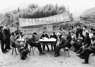 安徽岳西县位于大别山腹地,交通十分不便。针对山区群众打官司不便的实际,该县法院让法官“背包”下乡,安排了17个巡回法庭审理小组,每个月定期将巡回法庭开到村民家门口,将矛盾解决在基层。据了解,去年,巡回法庭在全县24个乡镇共审理了85件案件、成功调解纠纷57起,帮助群众解决生产生活实际困难76起。图为1月14日,岳西县法院的法官在青天乡老鸭村高枧村民组审理一起土地纠纷案件。 李博摄(人民视觉)